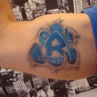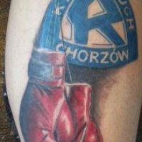 Tatuaż prezentujący logo klubu Ruch Chorzów.