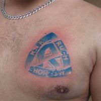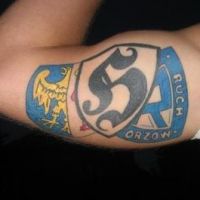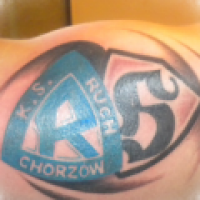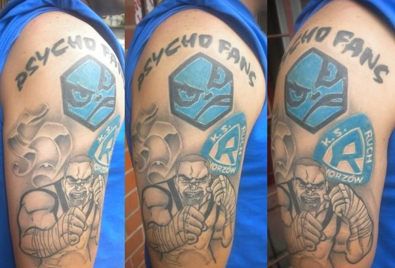 Dziara kibica Ruch Chorzów. Agresywny kibic i logo klubu w niebieskich barwach.