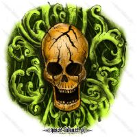 Oryginalny wzór z czaszką i skrzydłami na zielonym ornamencie. Żółta czaszka z czerwonymi elementami, do której domalowane są duże, niebieskie skrzydła.