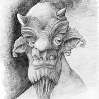Czarny wzór tatuażu z głową potwora, demon ma długie rogi na głowie. Jego długie palce ze szponami rozdzierają skórę spod której się wyłania. Bardzo ciekawy wzór tatuażu, który można wykonać w stylu biomechanicznym.