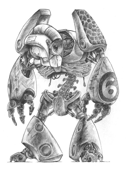 Projekt tatuażu z robotem. Duży robot z wieloma metalowymi częściami.