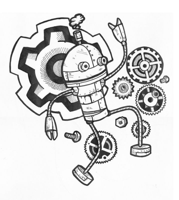 Niewielki robot i kilka części wokół niego. Nieco zabawny wzór na tatuaż.