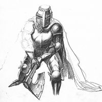 Rycerz w pełnej zbroi. Hełm ma ozdobiony piórami. W rękach trzyma miecz.
