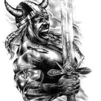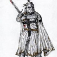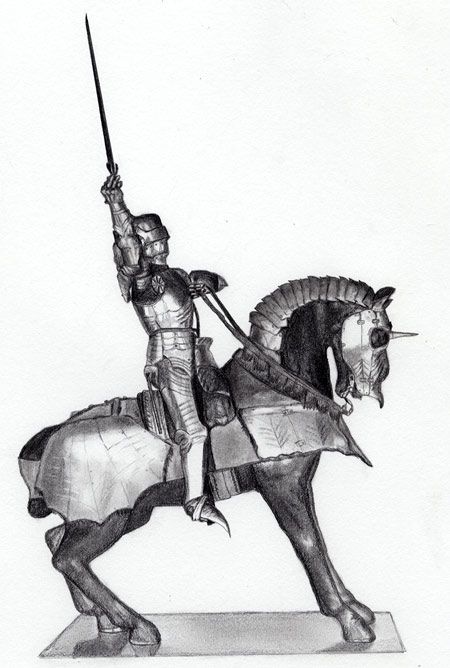 Projekt tatuażu z rycerzem na koniu. Postać jest ubrana w zbroję i ma uniesiony do góry miecz. Koń także osłonięty specjalnym hełmem z rogiem.
