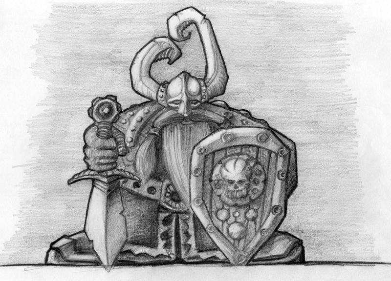 Wzór ze starym wikingiem trzymającym miecz i tarczę w rękach. Ma długa brodę i dwa rogi na głowie zakręcone do środka.