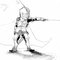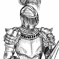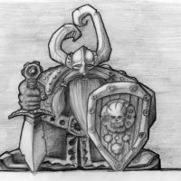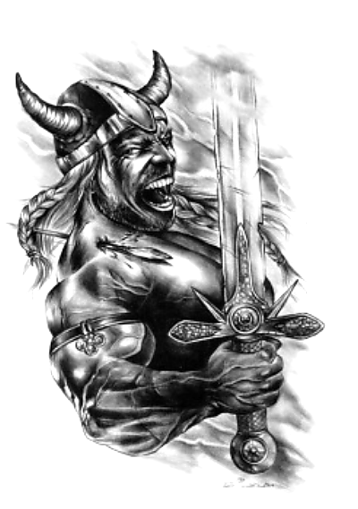 Wzór tatuażu z rycerzem w hełmie z rogami jak wiking. Spod hełmu wystają długie włosy. W prawej ręce trzyma gruby i ciężki miecz.