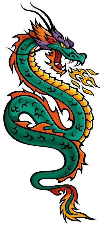 Wzór na tatuaż ze smokiem w kolorze zielonym. Ciało smoka pokrywają płomienia w odcieniach żółto-pomarańczowych. Smok jest zwinięty.