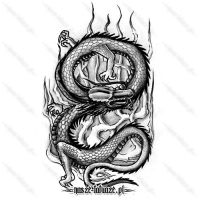 Wspaniały wzór tatuażu ze smokiem. Smok ma świetne kolory, grzywa i szpony wyglądają jak płomienie. Złoto-czerwony zór na czarnym tle.