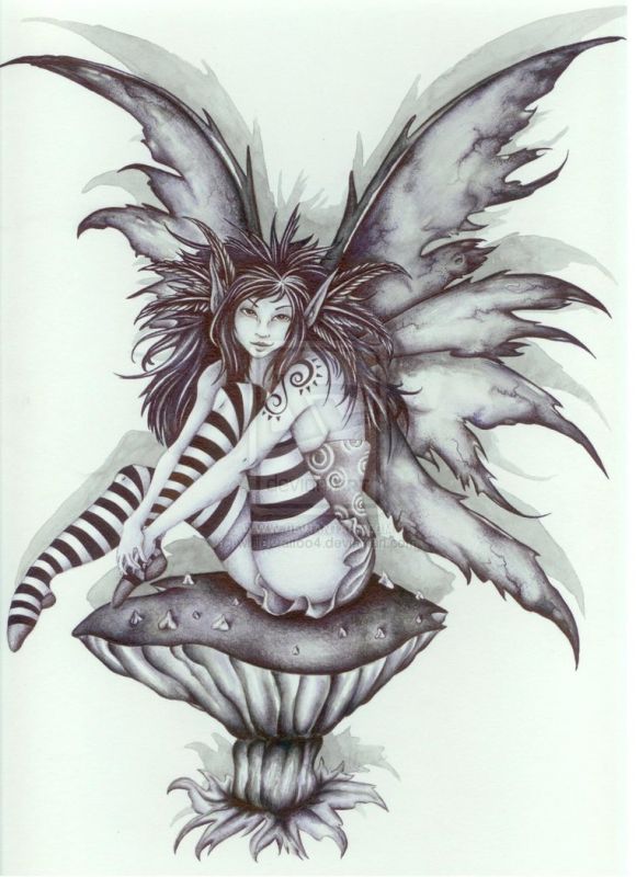 Wzór z kobietą siedzącą na ogromnym grzybie. Postać ma skrzydła motyla. Na głowie ma bujne czarne włosy, spod których wystają długie uszy.