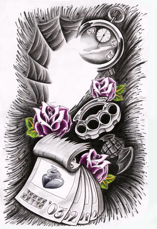 Ciekawy wzór z kartkami kalendarza i kwiatami. Róże są koloru różowego, pozostałe elementy w ciemnych odcieniach. Jest na rysunku kastet, granat i kompas.