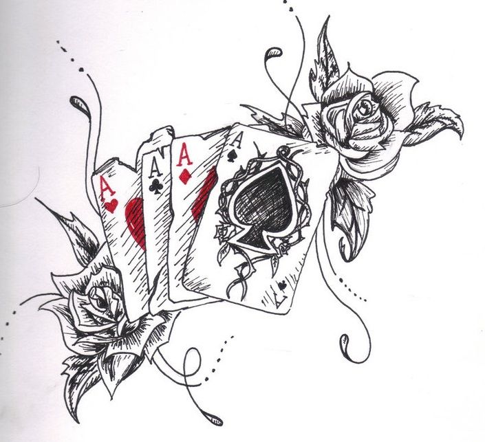 Wzór z kartami wśród kwiatów. Cztery asy w różnych karcianych kolorach.