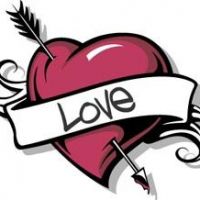Czerwone serce zranione mieczem i strzałą z kolorowymi kwiatami i wstęga z napisem "Bad love".