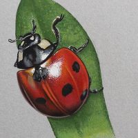 Czerwona biedronka w czarne kropki na zielonym liściu. Bardzo atrakcyjny wzorek na tatuaż dla kobiet.