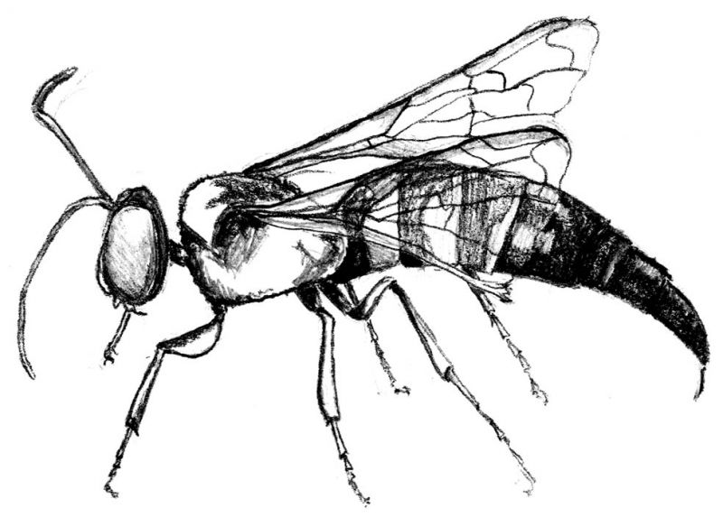 Projekt z owadem. Na rysunku widoczny każdy szczegół, przeźroczyste skrzydełka, głowa z dużymi oczami oraz cienki odwłok zakończony żądłem.