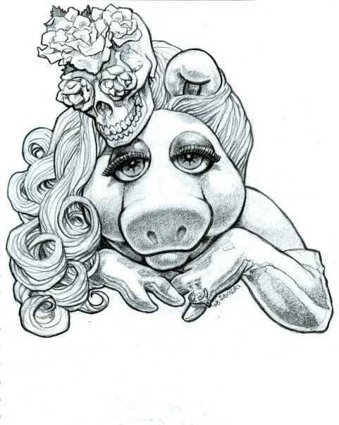 Rysunek przedstawiający zabawny motyw tatuażu. Postać z bajki - świnka Piggy. Świnka ma długie włosy, na których ma przypiętą ozdobę z czaszki z kwiatami.