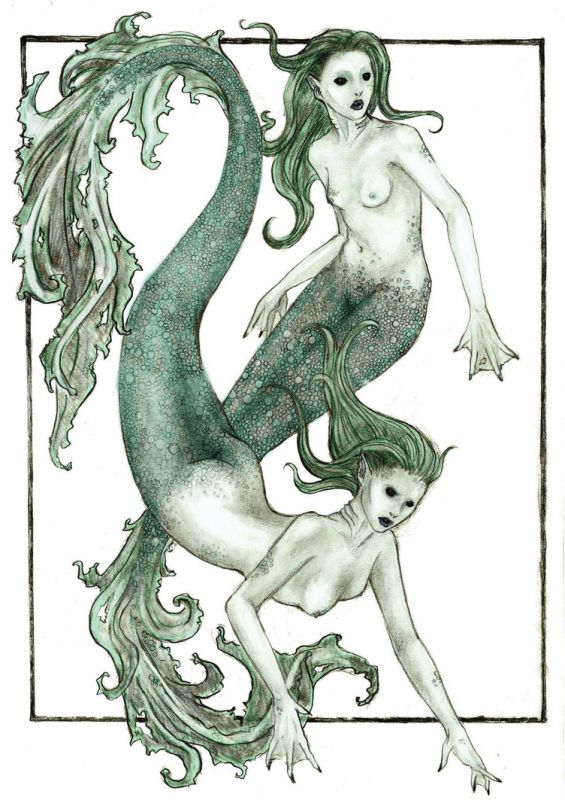 Nieco inne przedstawienie zodiakalnych ryb. Ryby pod postacią kobiet-syren z rybimi ogonami.