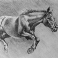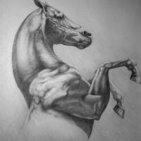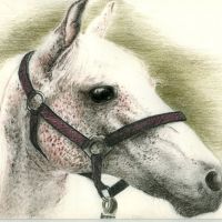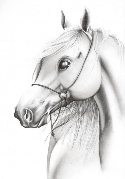 Projekt tatuażu z fragmentem głowy konia. Zwierzę widziane z profilu, ma długą grzywę jasne ciało. Przy pysku ma uwiązana uprząż.