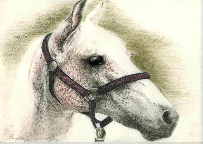 Piękny rysunek przedstawiający głowę konia. Koń jest koloru białego i ma na łbie zapięta uprząż.Wiele osób decyduje się na tatuaż z koniem, ze względu na głęboką symbolikę takich tatuaży oraz z miłości do tych zwierząt.