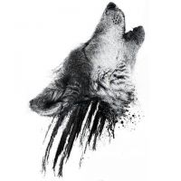 Rysowany wzór tatuażu przedstawiający wilki. Na pierwszym planie jest wilk wyjący z uniesioną głowa ku górze. Obok niego głowa kolejnego wilka, tym razem patrzącego na wprost. W tle jest cień wilka stojącego na skarpie na tle ogromnego księżyca.