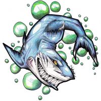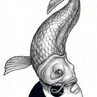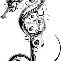 Wzór tatuażu z konikiem morskim. Postać na rysunku ma kolorowe ciało, różne barwy tworzą ciekawy wzorek.